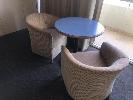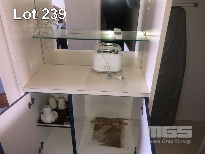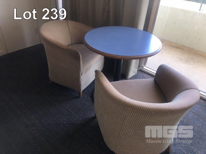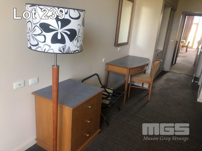 CONTENTS OF ROOM, KING SIZE ENSEMBLE, 3 x CLOTH CHAIRS, COFFEE TABLE, PEDESTAL LAMP, WALL MOUNT MIRROR, 1 x CURVED FRONT TIMBER DESK & MATCHING 3 DRAWER CHEST, IRONING BOARD, BEDSIDE CABINET
