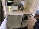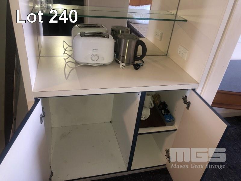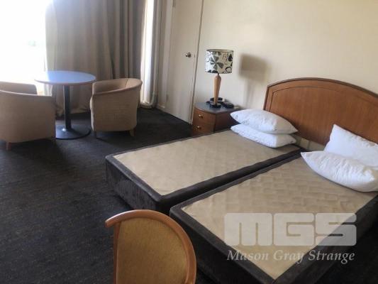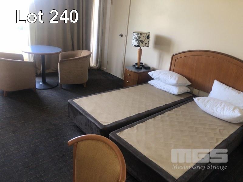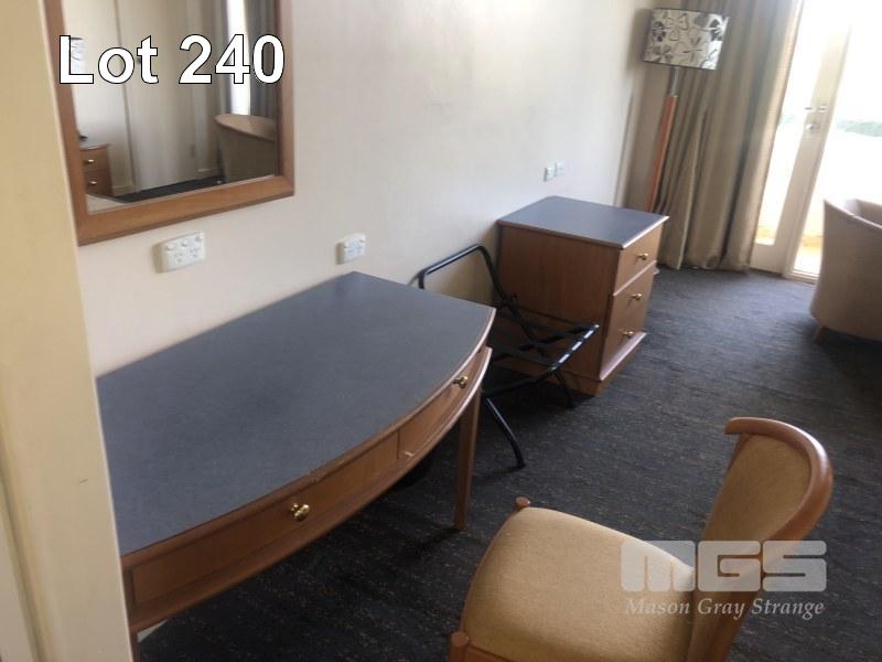 CONTENTS OF ROOM, 2 x SINGLE SIZE BED BASES, 3 x CLOTH CHAIRS, COFFEE TABLE, PEDESTAL LAMP, WALL MOUNT MIRROR, 1 x CURVED FRONT TIMBER DESK & MATCHING 3 DRAWER CHEST, IRONING BOARD, BEDSIDE CABINET
