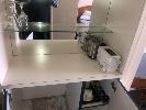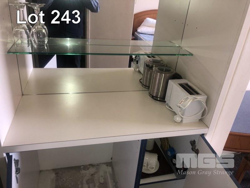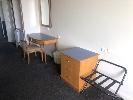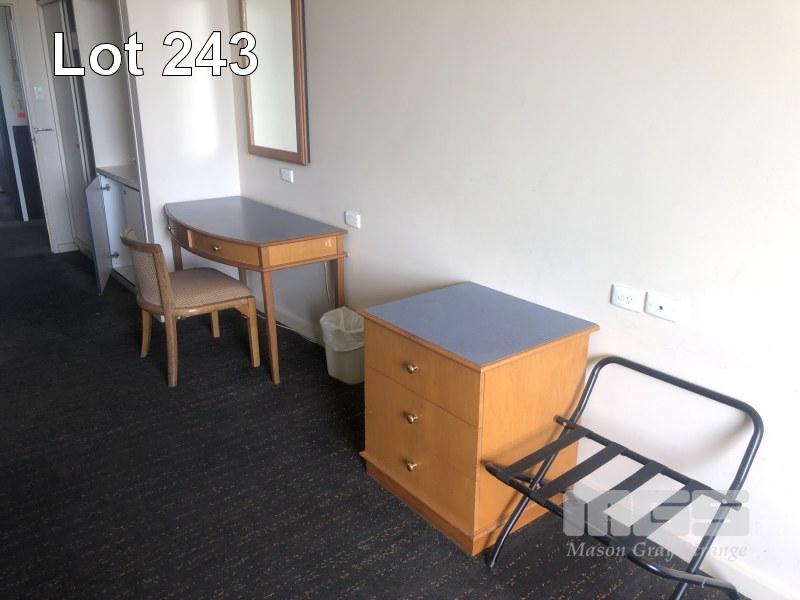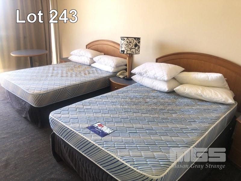 CONTENTS OF ROOM, QUEEN SIZE ENSEMBLE, DOUBLE SIZE ENSEMBLE, 3 x CLOTH CHAIRS, COFFEE TABLE, PEDESTAL LAMP, WALL MOUNT MIRROR, 1 x CURVED FRONT TIMBER DESK & MATCHING 3 DRAWER CHEST, IRONING BOARD, BEDSIDE CABINET