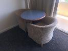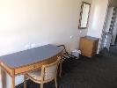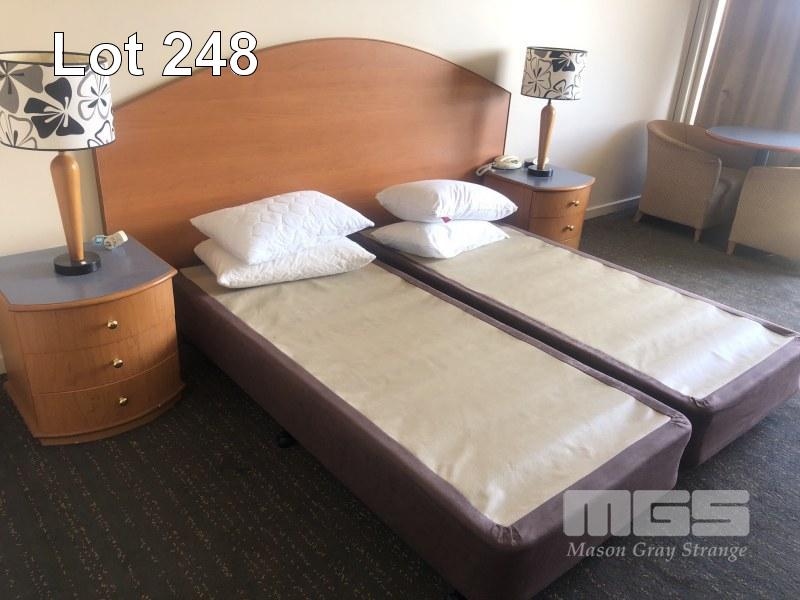 CONTENTS OF ROOM, 2 x SINGLE BED BASES, BAR FRIDGE,3 x CLOTH CHAIRS, COFFEE TABLE, PEDESTAL LAMP, WALL MOUNT MIRROR, 1 x CURVED FRONT TIMBER DESK & MATCHING 3 DRAWER CHEST, IRONING BOARD, BEDSIDE CABINET