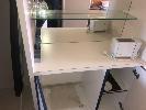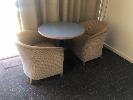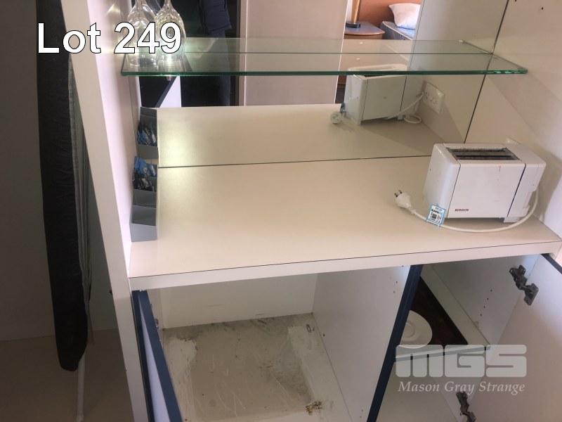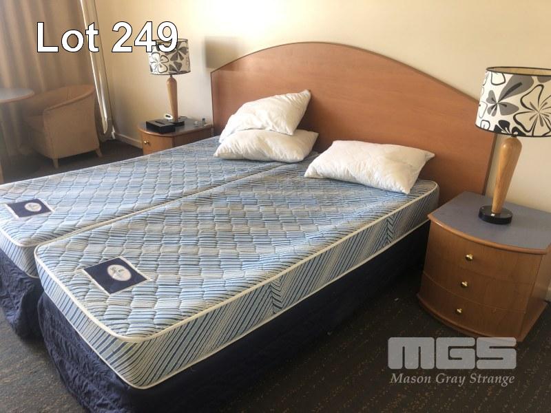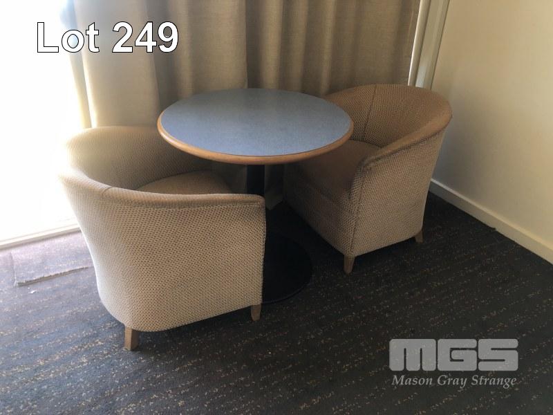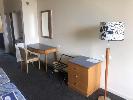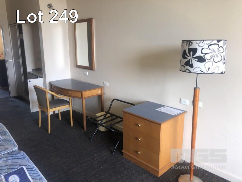 CONTENTS OF ROOM, 2 x SINGLE SIZE ENSEMBLES, 3 x CLOTH CHAIRS, COFFEE TABLE, PEDESTAL LAMP, WALL MOUNT MIRROR, 1 x CURVED FRONT TIMBER DESK & MATCHING 3 DRAWER CHEST, IRONING BOARD, BEDSIDE CABINET