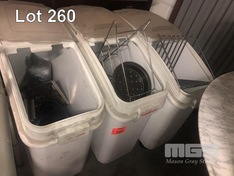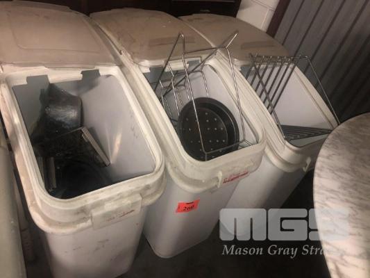 3 x WHITE POLY KITCHEN FOOD BINS, MOBILE WITH CONTENTS, VARIOUS STAINLESS STEEL POTS, RACKS, ETC