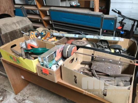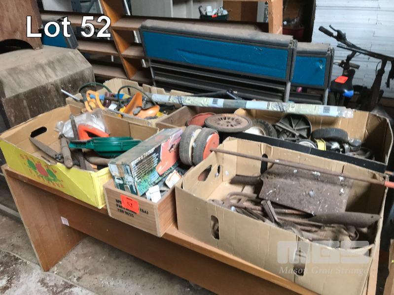 ASSORTED GARDENING HAND TOOLS, WHEELS & HARDWARE, 1 x TABLE