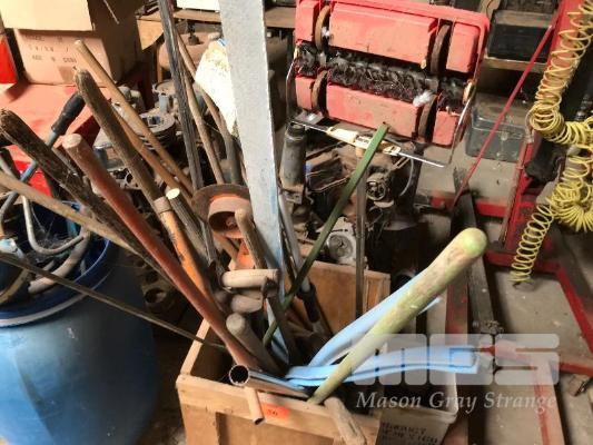 TIMBER CRATE & CONTENTS GARDEN HAND TOOLS, CLEANING & PLASTIC TUBE OF CHAIN