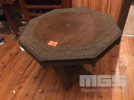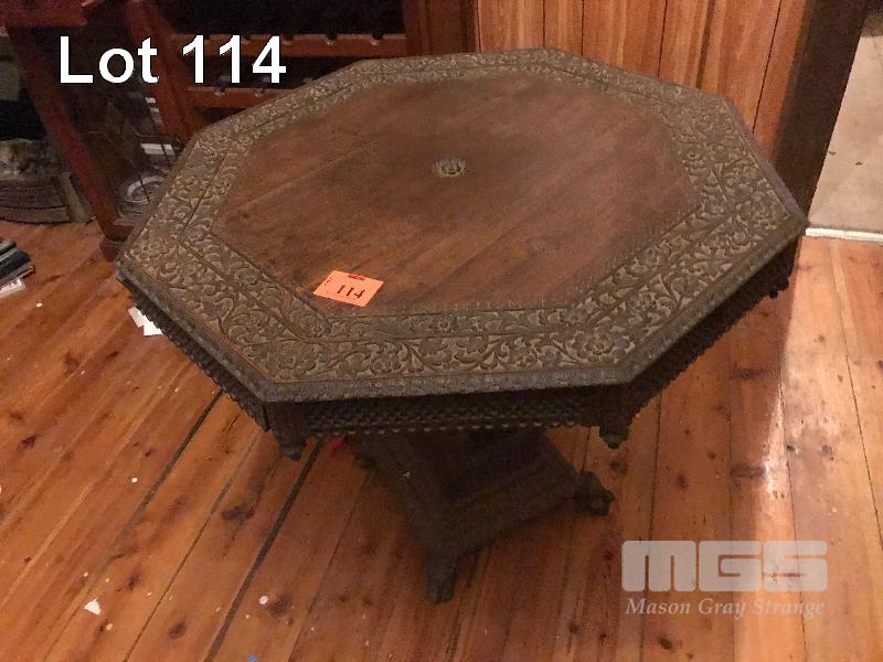 ANTIQUE OCTAGONAL TABLE,SINGLE PEDESTAL, ORNATE FLORAL CARVING
