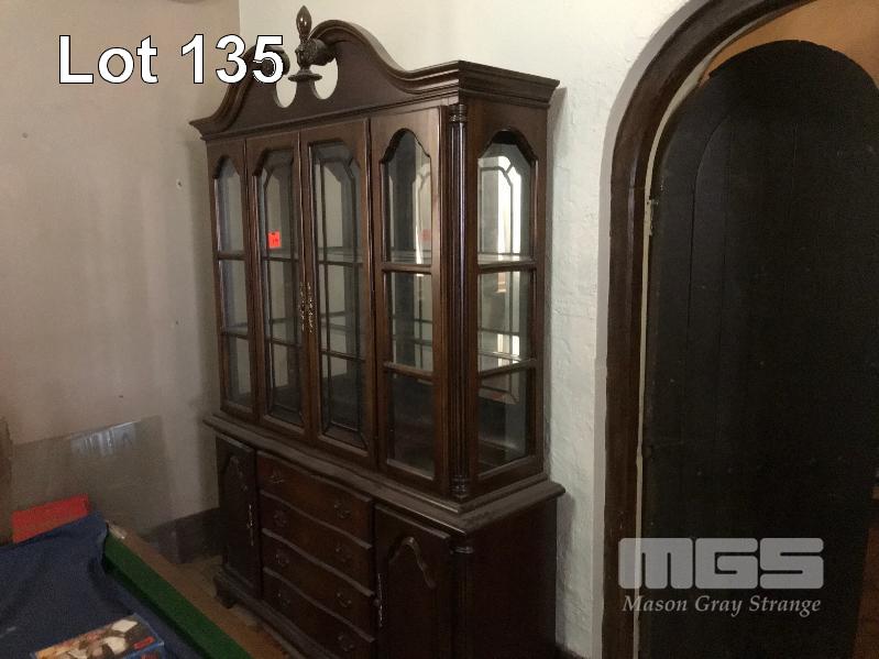 LARGE TIMBER 2 PIECE WALL UNIT, 2 DOOR GLASS FRONTED TOP SECTION WITH 4 DRAWER 2 DOOR UNDER STORAGE