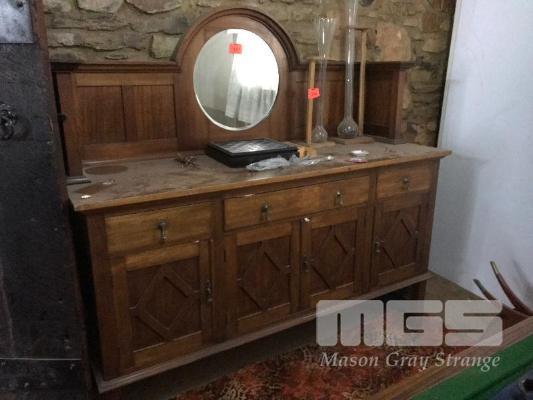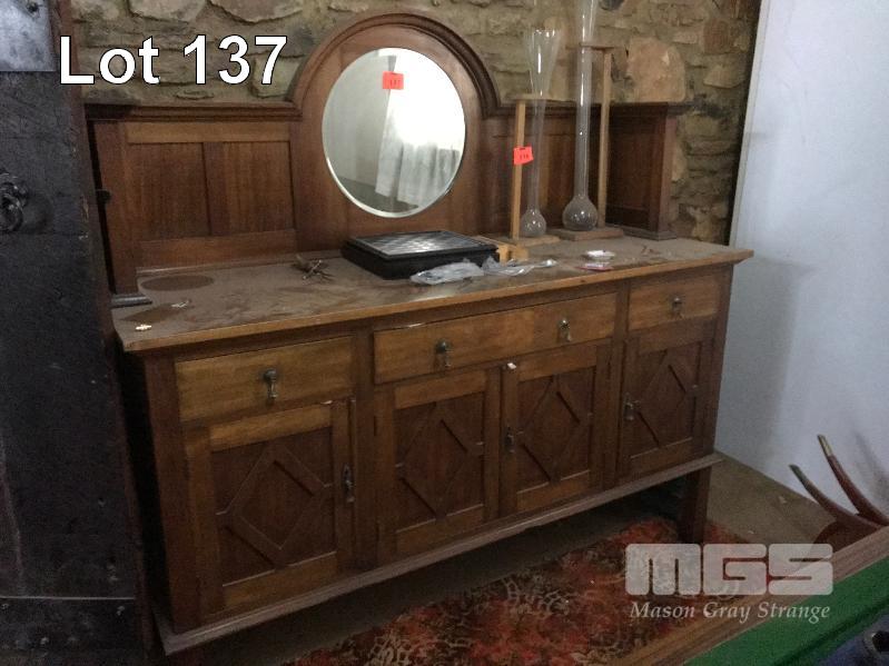 OAK SIDEBOARD, CIRCULAR MIRROR BACKED PANEL WITH 4 DOOR, 3 DRAWER UNDER STORAGE