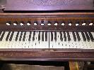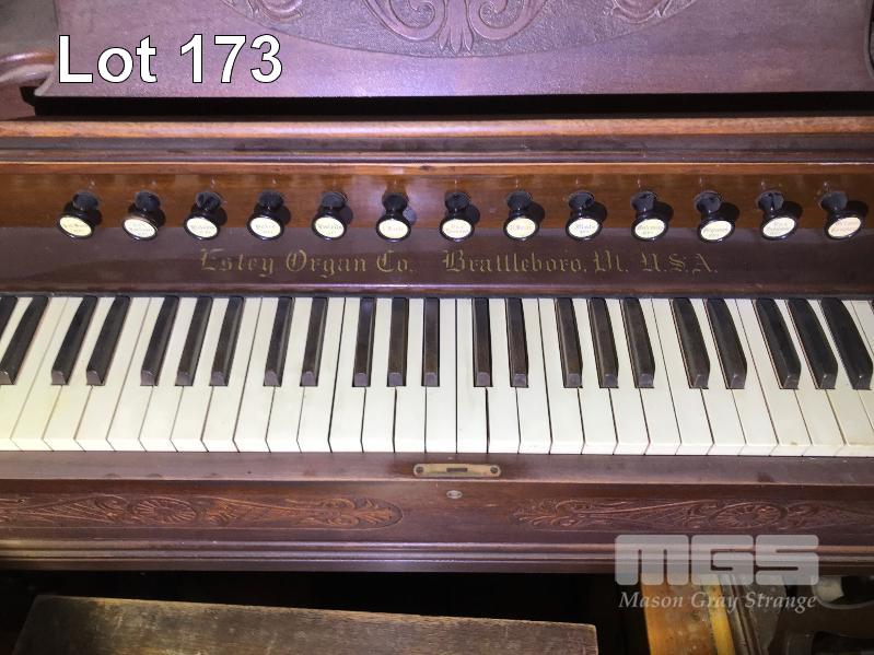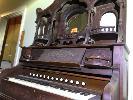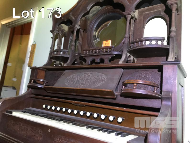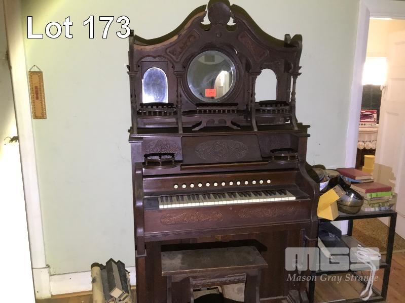 CARVED TIMBER BELLOWS ORGAN, ESTRY ORGAN CO, BRATTLEBORO, USA & MIRROR BACKED OVERSHELF, 1 x MIRROR MISSING, 1 x STOOL