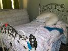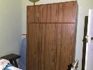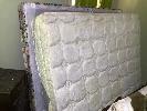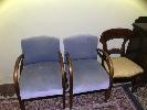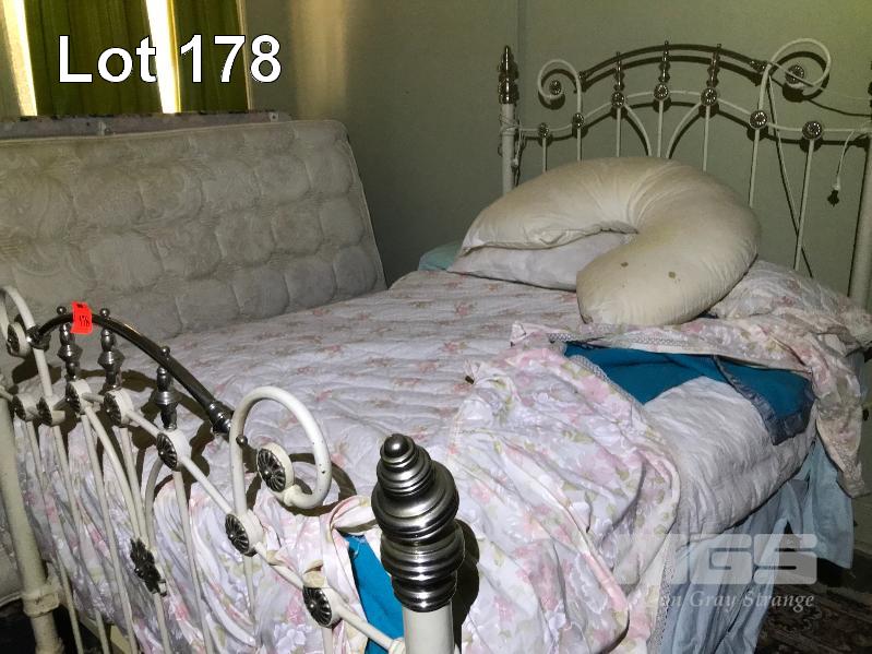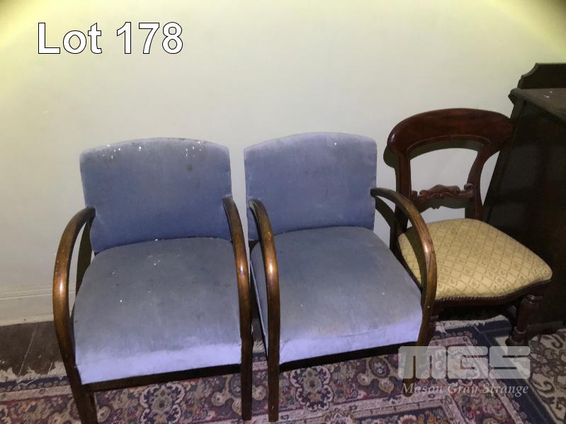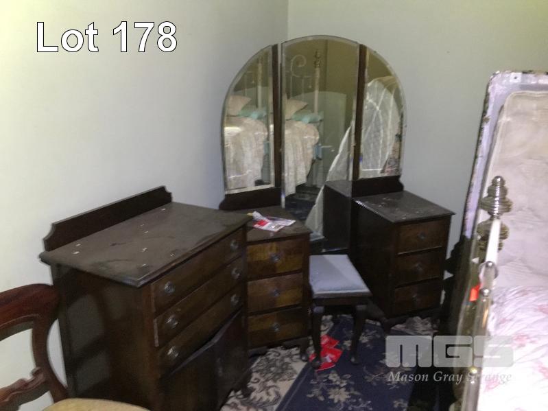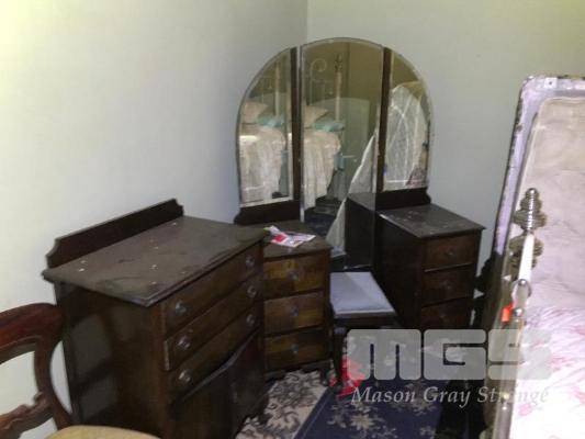 WOODGRAIN LAMINATE WARDROBE, PEDESTAL, WROUGHT IRON KING SINGLE BED, DOUBLE BED ENSEMBLE BASE & MATTRESS, MIRROR BACK WINGED DRESSER, BEDROOM CABINET, 2 x ARM CHAIRS, DECO STYLE & SPADE BACKED DINING CHAIR