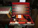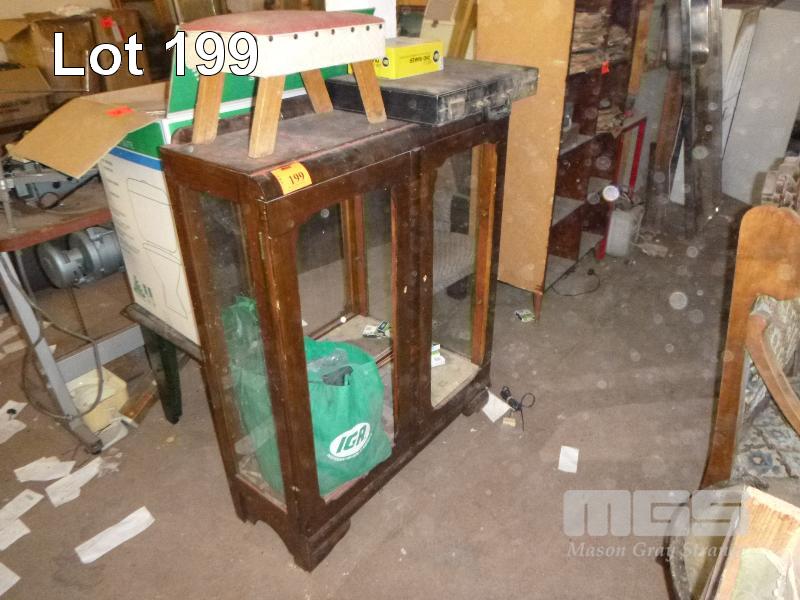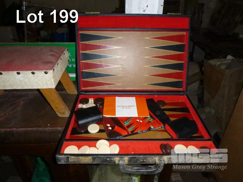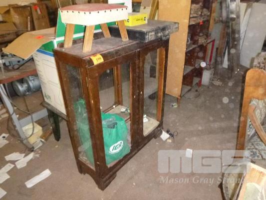 TIMBER, 2 DOOR CHINA DISPLAY CABINET, ARM CHAIR, BACKGAMMON GAME IN CASE & VINTAGE VINYL STOOL