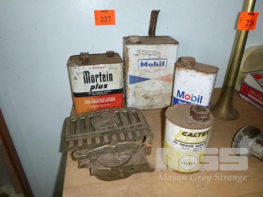 ASSORTED OIL TINS, RUGBY BRAND GRATES, PUNCTURE REPAIR PRESS, ETC
