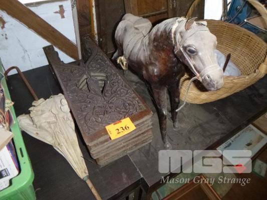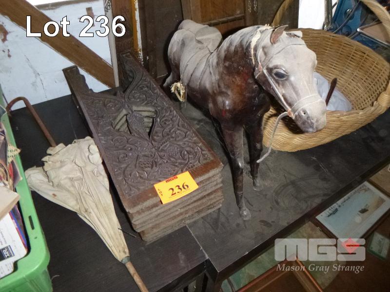 ANTIQUE LEATHER BOUND HORSE & DECORATIVE CARVED STAND