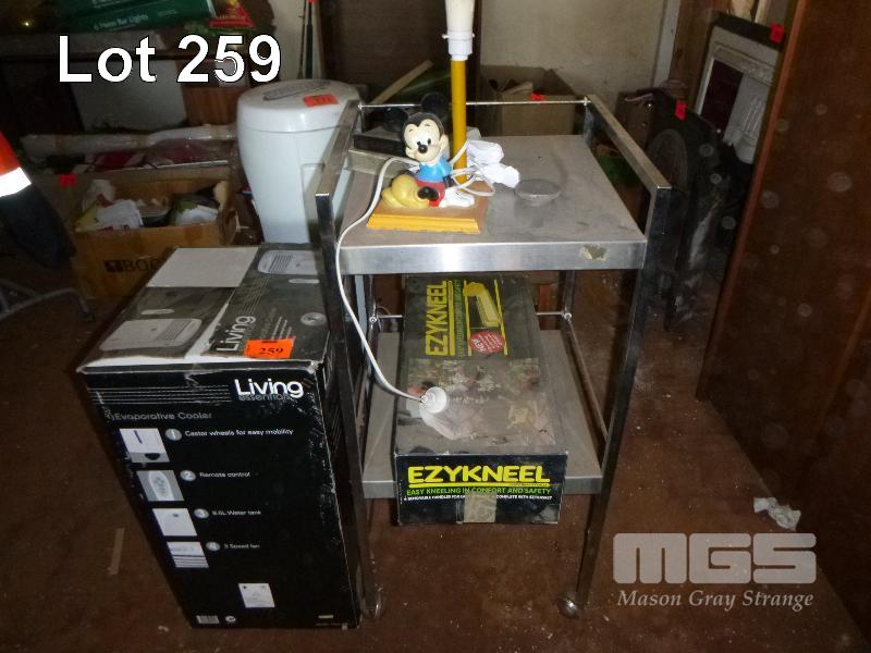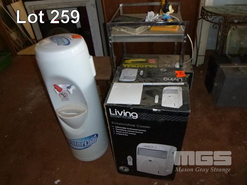 LIVING ESSENTIALS EVAPORATIVE COOLER, STAINLESS STEEL TROLLEY, HOT/COLD WATER DISPENSER & NEST TABLES
