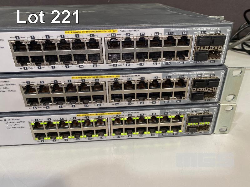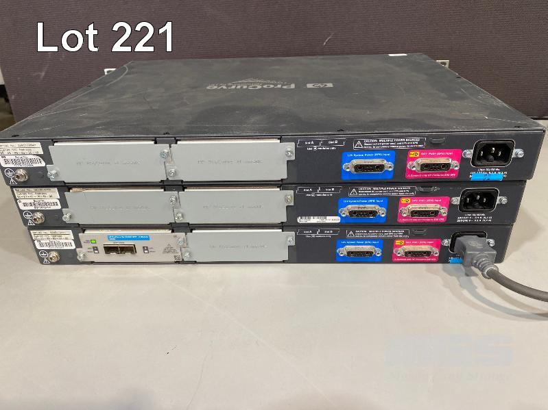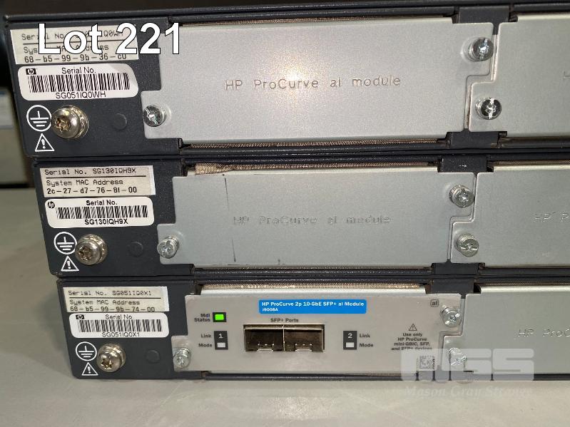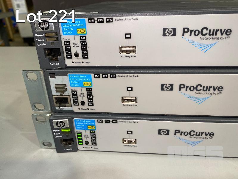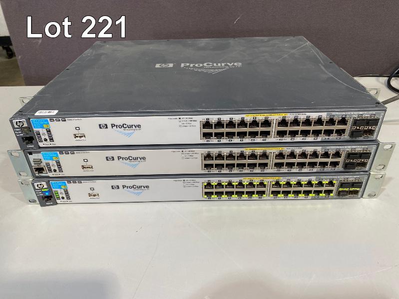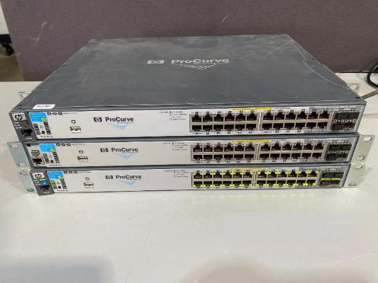 3 x HP PROCURVE 2910al-24G-PoE+ 24-PORT SWITCHES, J9146A WITH 1 x 10-GbE SFP+ al MODULE, J9008A (NOTE: NO NOTCH POWER CABLES) S/N:SG051IQ0WH, SG130IQH9X, SG051IQ0X1