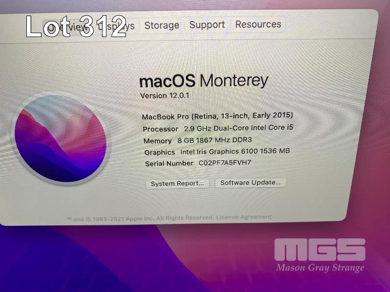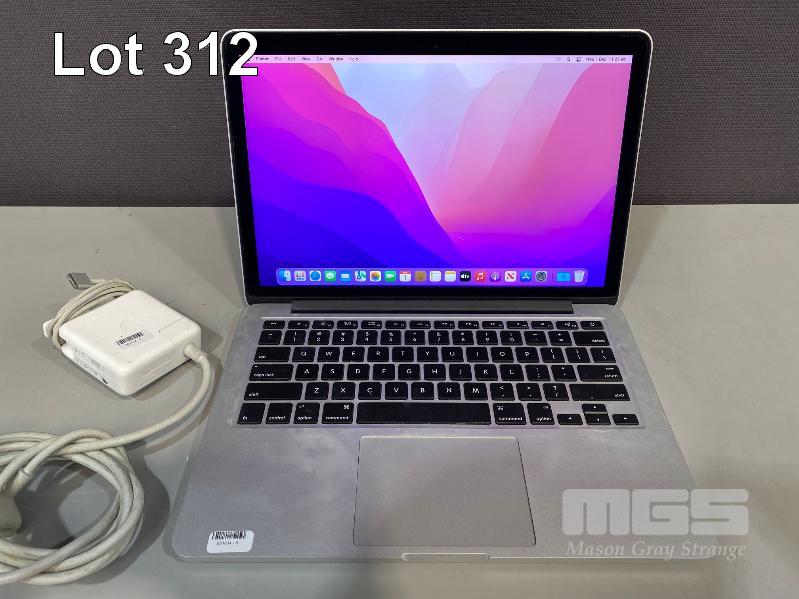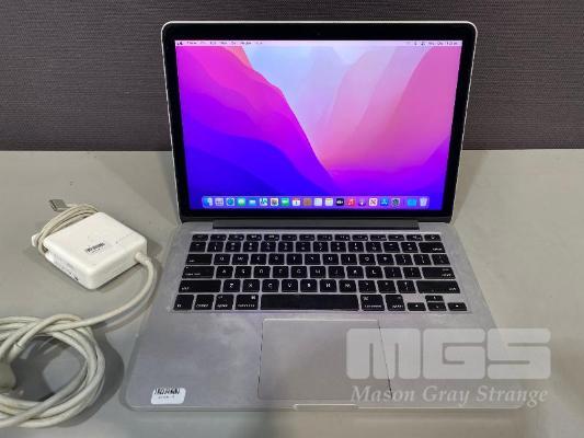 LAPTOP, APPLE MACBOOK PRO (A1502), CORE i5 5287U (5TH GEN) @ 2.9GHz, 8GB DDR3 RAM, 512GB SSD, 13.3" RETINA WIDESCREEN (2560x1600), INTEL IRIS GRAPHICS, Wi-Fi, MAC OS 12 INSTALLED & POWER SUPPLY (NOTE: MARKS ON SCREEN) S/N:C02PF7A5FVH7