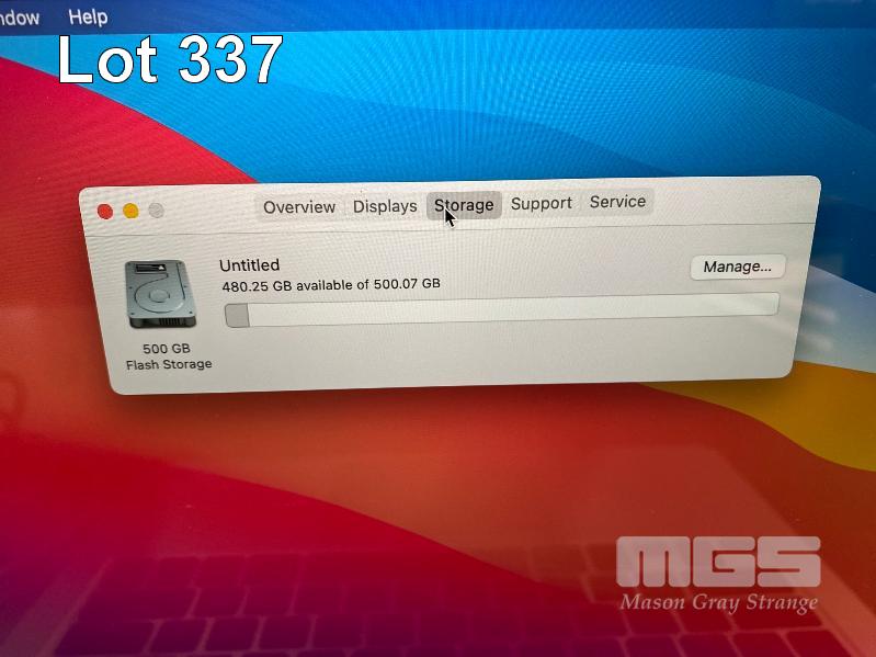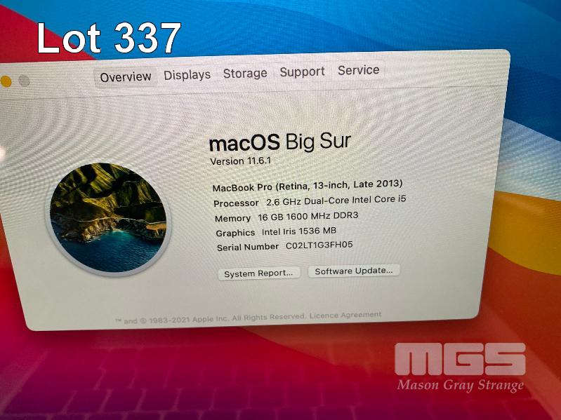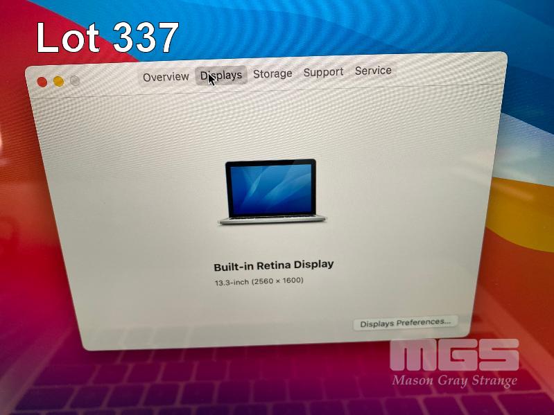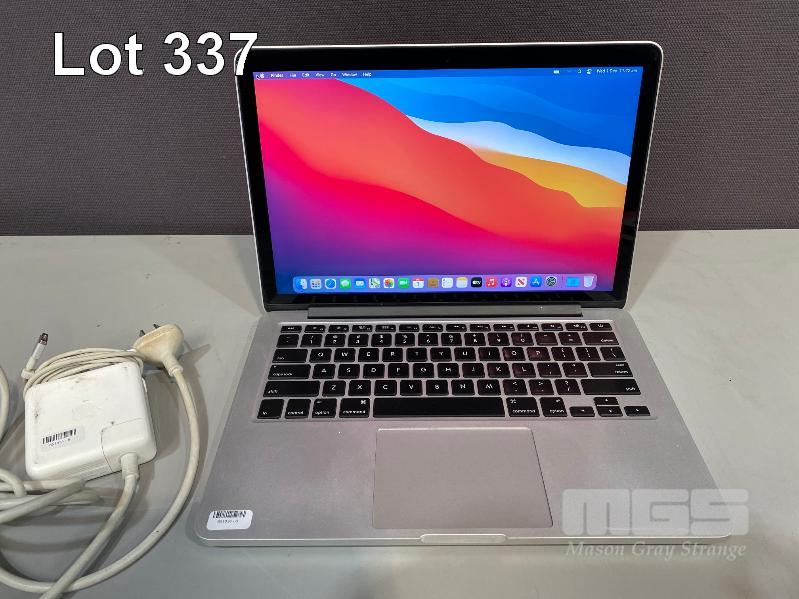 LAPTOP, APPLE MACBOOK PRO (A1502), CORE i5 4288U (4TH GEN) @ 2.6GHz, 16GB DDR3 RAM, 512GB SSD, 13.3" RETINA WIDESCREEN (2560x1600), INTEL IRIS GRAPHICS, Wi-Fi, MAC OS 11.6 INSTALLED & POWER SUPPLY (NOTE: MARKS ON SCREEN) S/N:C02LT1G3FH05