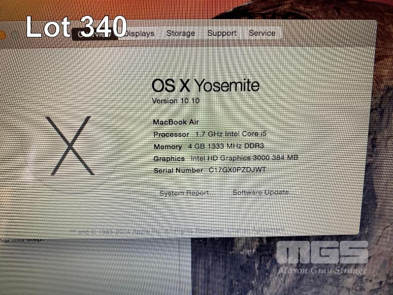 LAPTOP, APPLE MACBOOK AIR (A1369), CORE i5 2557M (2ND GEN) @ 1.7GHz, 4GB DDR3 RAM, 128GB SSD, 13.3" WIDESCREEN (1440x900), INTEL HD VIDEO, Wi-Fi, MAC OS 10.10 INSTALLED & POWER SUPPLY (NOTE: KEYBOARD / TOUCH PAD NOT DETECTED, BATTERY NOT DETECTED) S/N:C17GX0PZDJWT