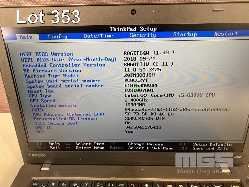 LAPTOP, LENOVO THINKPAD T460 (20FMS0QJ0H), CORE i5 6300U (6TH GEN) @ 2.4GHz, 16GB DDR3 RAM, 256GB SSD, 14" WIDESCREEN (1920x1080), INTEL HD VIDEO, Wi-Fi, BLUETOOTH, WINDOWS 10 PRO INSTALLED & POWER SUPPLY (NOTE: MARKS ON SCREEN) S/N:PC0CC2YT