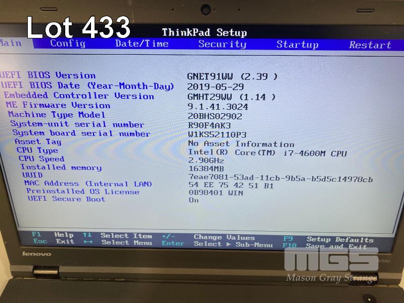 LAPTOP, LENOVO THINKPAD W540 (20BHS02902), CORE i7 4600M (4TH GEN) @ 2.9GHz, 16GB DDR3 RAM, 256GB SSD, DVD-RW, 15.6" WIDESCREEN (1920x1080), INTEL HD VIDEO, 2GB NVIDIA QUADRO K1100M VIDEO, Wi-Fi, BLUETOOTH, WINDOWS 10 PRO INSTALLED & POWER SUPPLY (NOTE: MINOR MARKS ON SCREEN) S/N:R90F4AK3