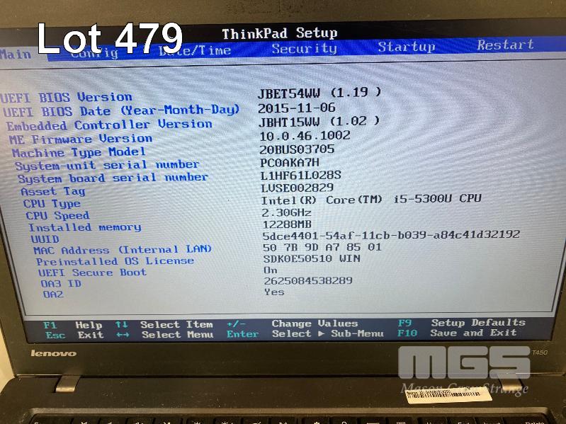 LAPTOP, LENOVO THINKPAD T450 (20BUS03705), CORE i5 5300U (5TH GEN) @ 2.3GHz, 12GB DDR3 RAM, 525GB SSD, 14" WIDESCREEN (1366x768), INTEL HD VIDEO, Wi-Fi, BLUETOOTH, WINDOWS 10 PRO INSTALLED & POWER SUPPLY (NOTE: MARKS ON SCREEN) S/N:PC0AKA7H