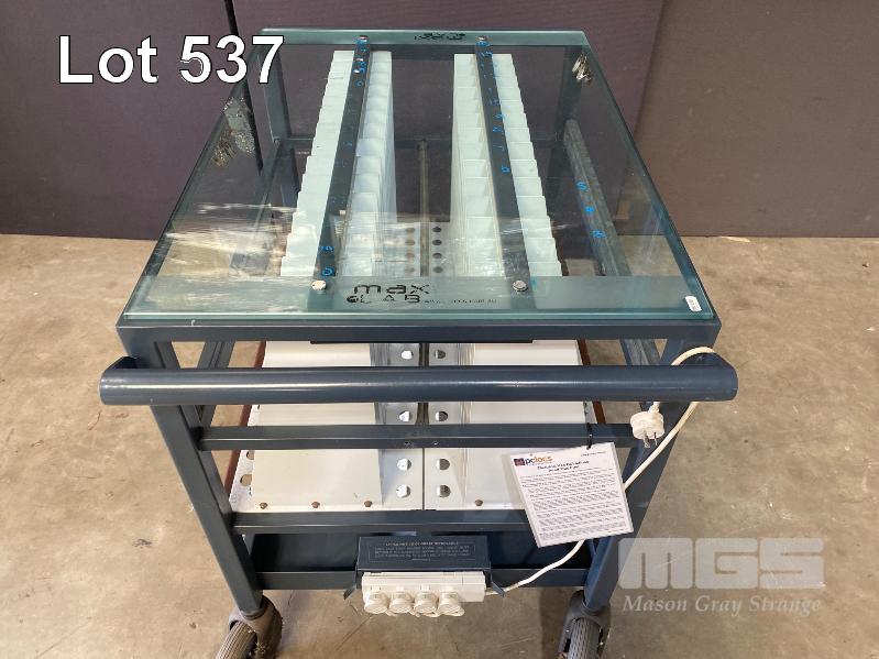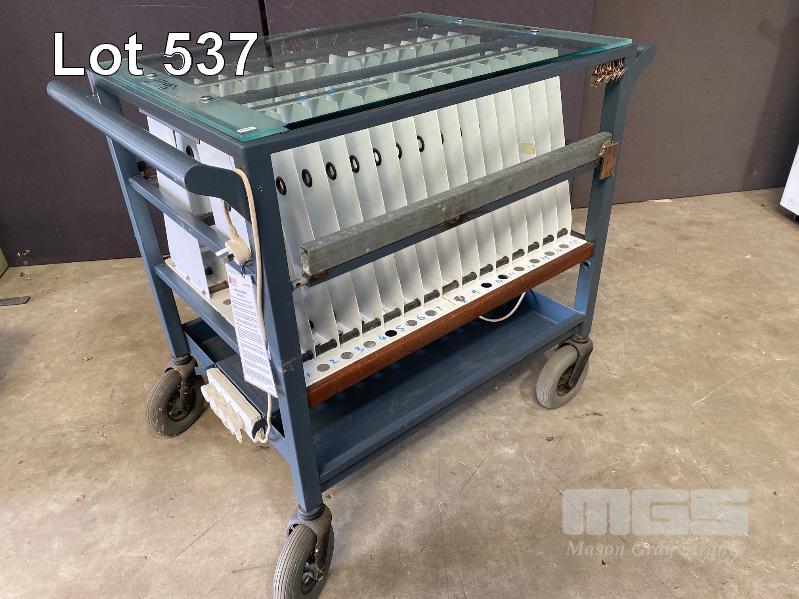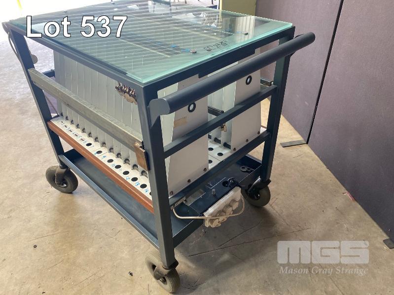 PC LOCS MAXI LAB 30 BAY LAPTOP TROLLEY, GLASS TOP, STEEL FRAME WITH POWER BOARDS, 99 x 92 x 70cm