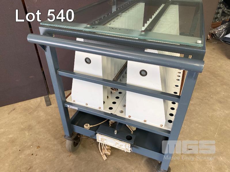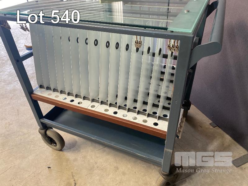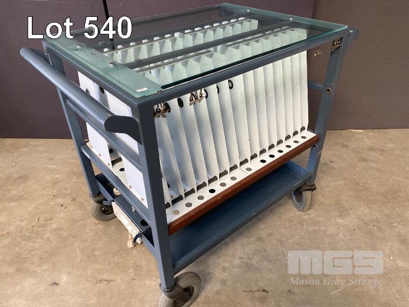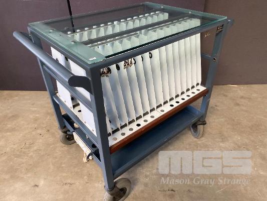 PC LOCS MAXI LAB 30 BAY LAPTOP TROLLEY, GLASS TOP, STEEL FRAME WITH POWER BOARDS, 99 x 92 x 70cm (NOTE: NO LOCKING BARS)