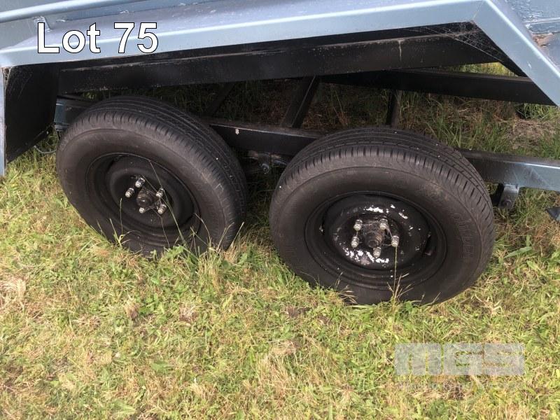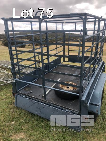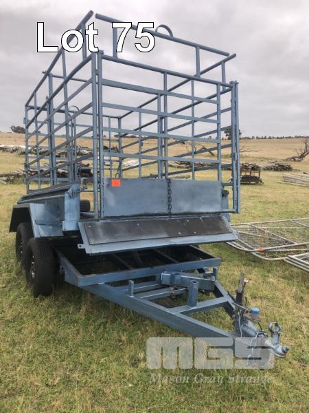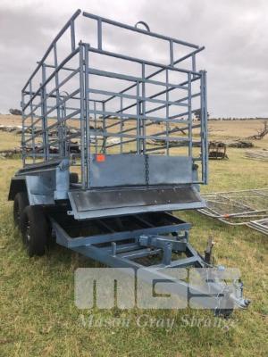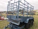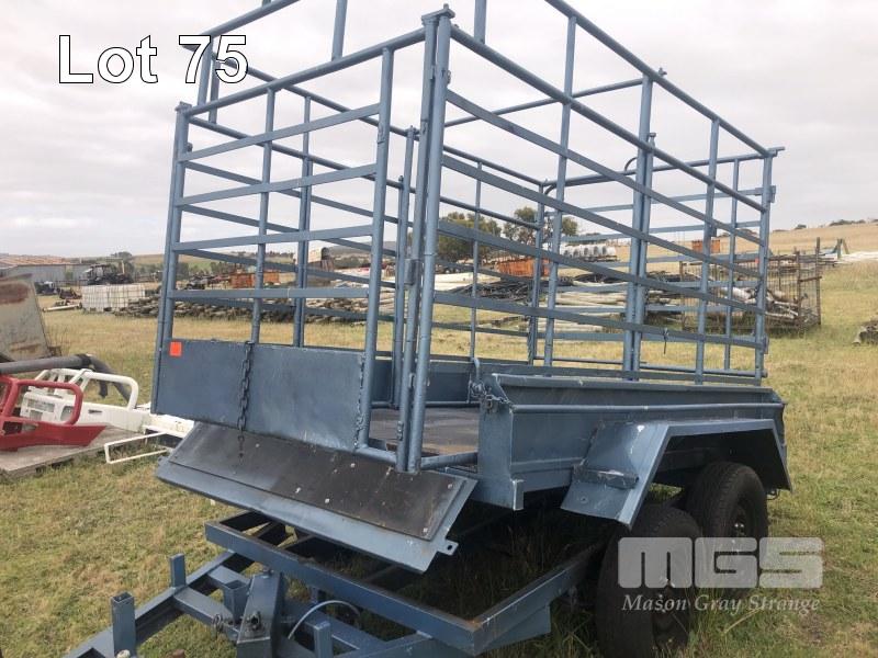 TIPPING TRAILER, TANDEM AXLE 8x5 NO REG WITH DROP IN STOCK CRATE MANUAL HYDRAULIC TIP 50mm HITCH & BRAKES