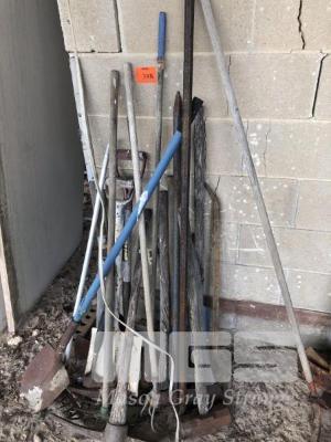 GARDEN TOOLS, PICK AXE SHOVELS, SPADES, ETC