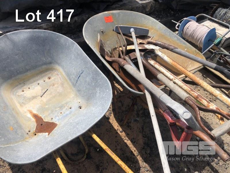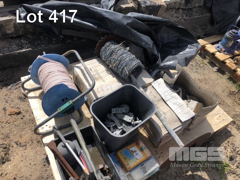 2 x BARROWS & TOOLS, BARB WIRE FENCE STRAINERS, ELEC FENCE ENERGISER, ETC