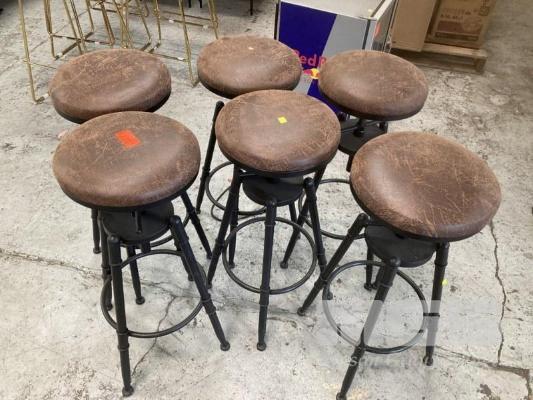 6 x BAR STOOLS, DISTRESSED LEATHER LOOK, BLACK STEEL FRAME