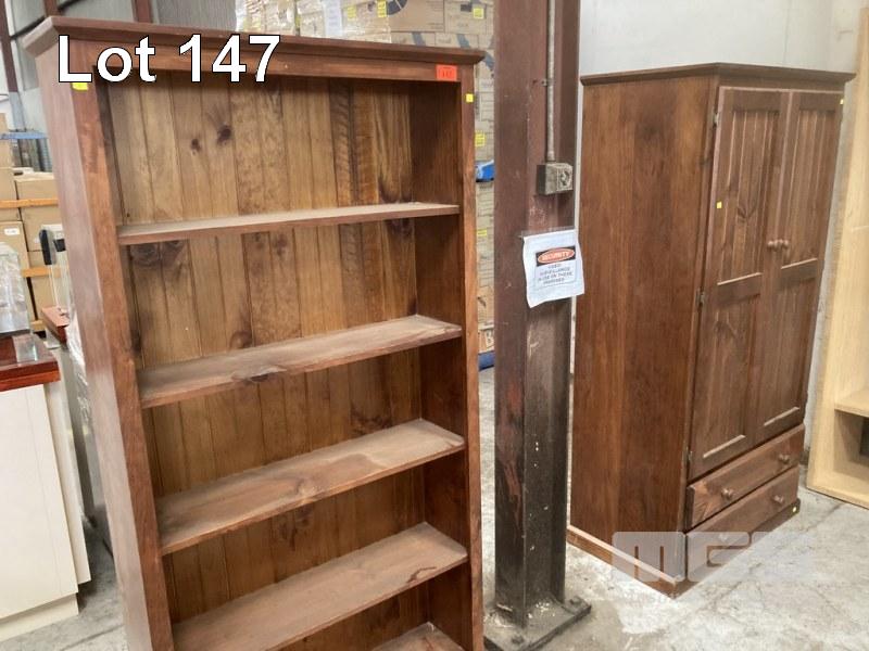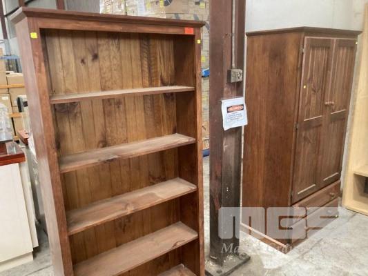 STAINED TIMBER WARDROBE 2 DOOR WITH 2 x BOTTOM DRAWERS, 960 x 1830mm (H) & BOOKCASE, 5 TIER, 960 x 1830mm (H) (MATCHING)