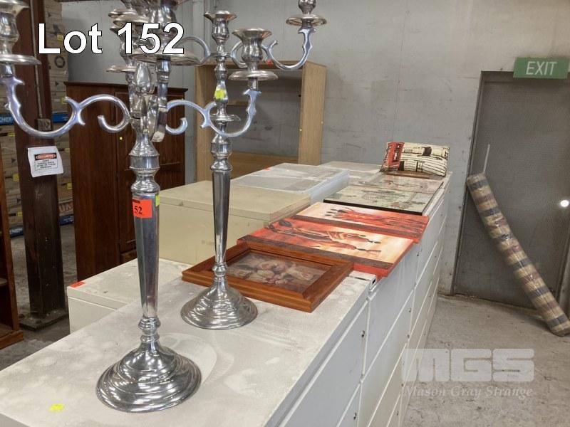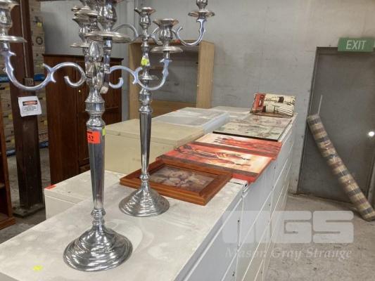 2 x CANDLE HOLDERS, MATCHING STYLE POLISHED ALLOY FINISH 5 & 3 CANDLE WITH ASSORTED PAINTINGS