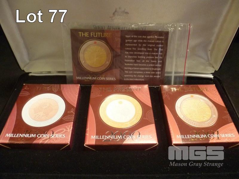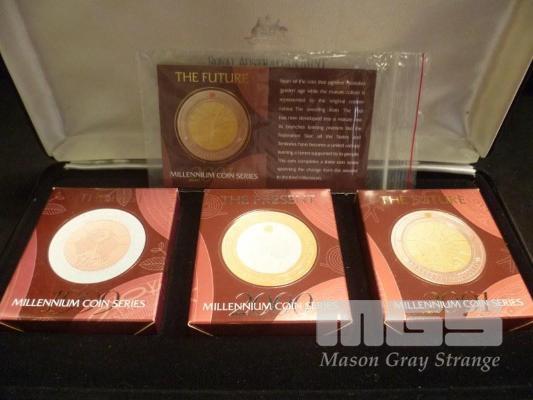 ROYAL AUSTRALIAN MINT, 'MILLENIUM COIN SERIES', ' THE PAST, THE PRESENT, THE FUTURE', 1999, 2000, 2001, $10 BIMETALLIC PROOF COINS (OUTER CARDBOARD PACKAGING DAMAGED)