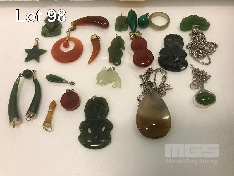 ASSORTED GREEN & COLOURED JADE PENDANTS, ETC
