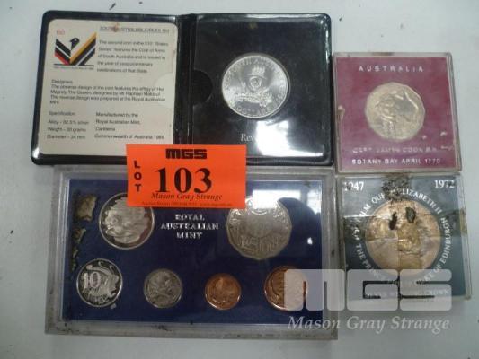 RAM PROOF COIN SET, 1983, LLOYDS BANK CROWN, CAPTAIN COOK 50 CENT, S.A TEN DOLLAR COIN COVERS & INSERTS POOR CONDITION