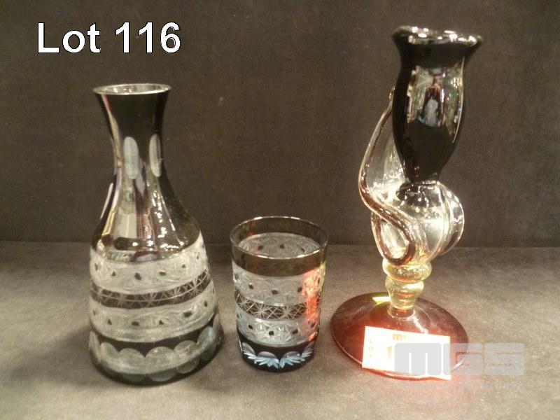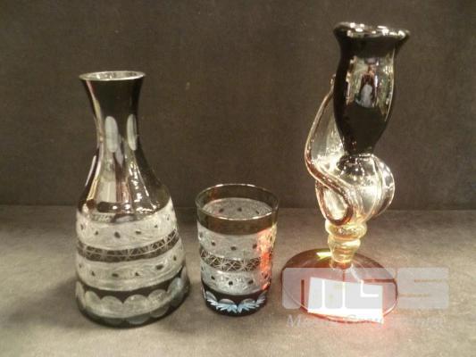 BLACK, CUT CRYSTAL DECANTER WITH MATCHING CUP & ART GLASS CANDLE HOLDER