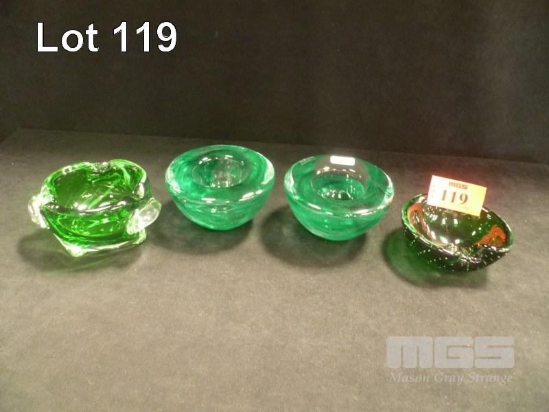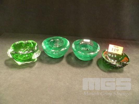 PAIR GREEN ART GLASS KOSTA BODA BOWLS WITH 2 x ART GLASS ASHTRAYS