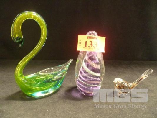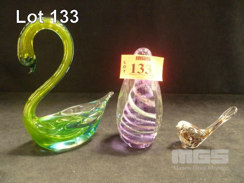 3 x ART GLASS PIECES INC ELONGATED PAPER WEIGHT, SWAN & SMALL BIRD