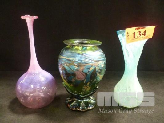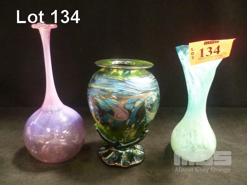 3 x HAND BLOWN ART GLASS VASES, 20.5cm TALLEST