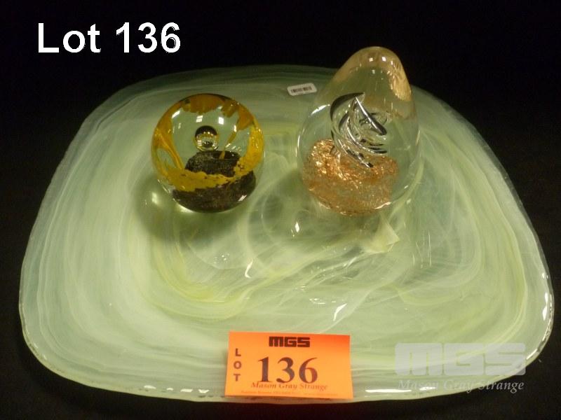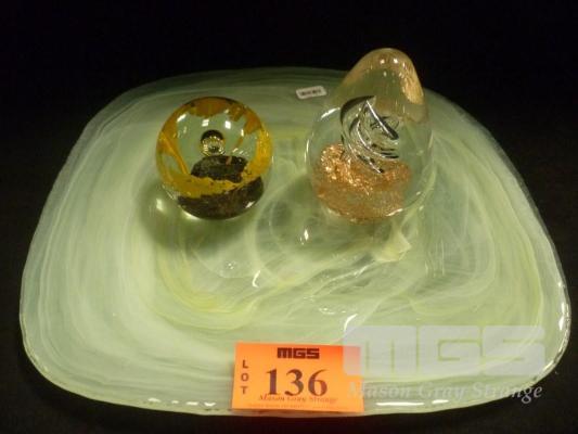 ART GLASS PLATE & 2 x GLASS PAPER WEIGHTS