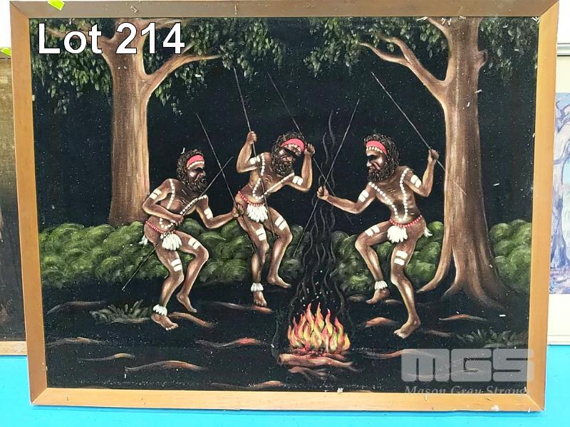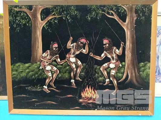 OIL PAINTING OF ABORIGINAL CORROBOREE ON BLACK FELT BY "W.W. BRUNOTTE"