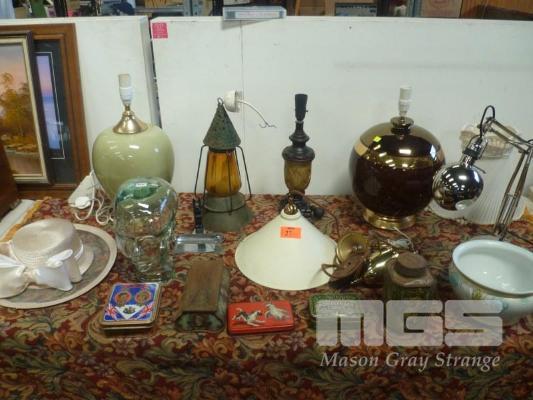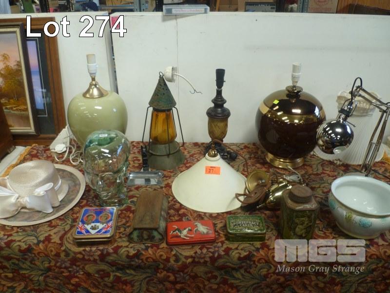 ASSORTED TABLE LAMPS, LIGHT FITTINGS, VINTAGE TINS, GLASS HEAD, LADIES HAT, ETC