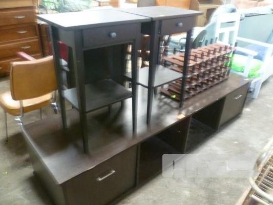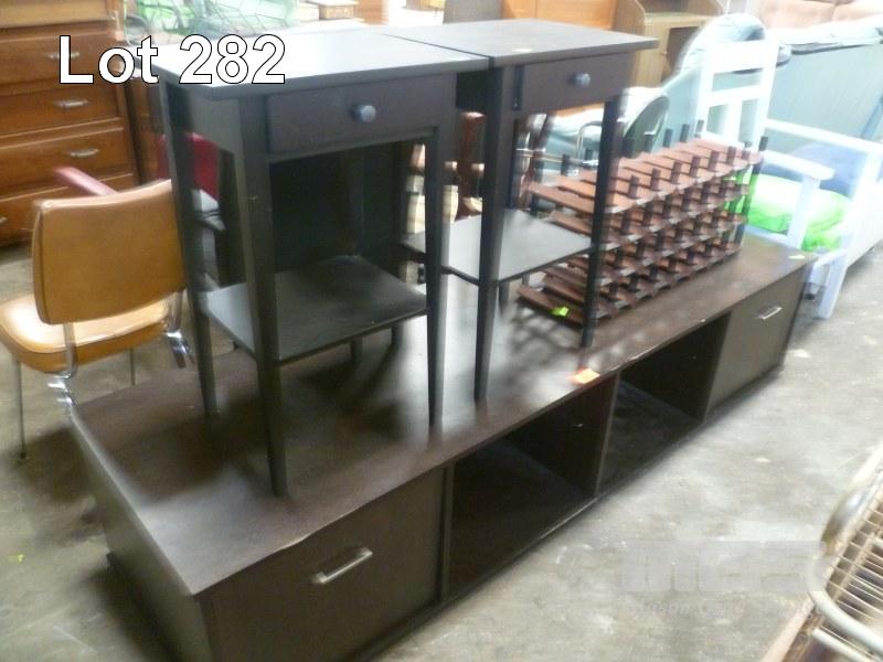 TIMBER LAMINATE LOWLINE ENTERTAINMENT UNIT, 210cm (L), PAIR SINGLE DRAWER UNITS & WINE RACK
