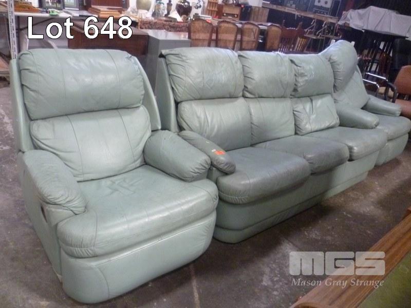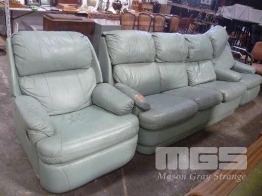 GREEN LEATHER 3 PIECE LOUNGE SUITE INC 3 SEATER, ALL FAULTS, CUSHION TORN & 2 x SINGLES