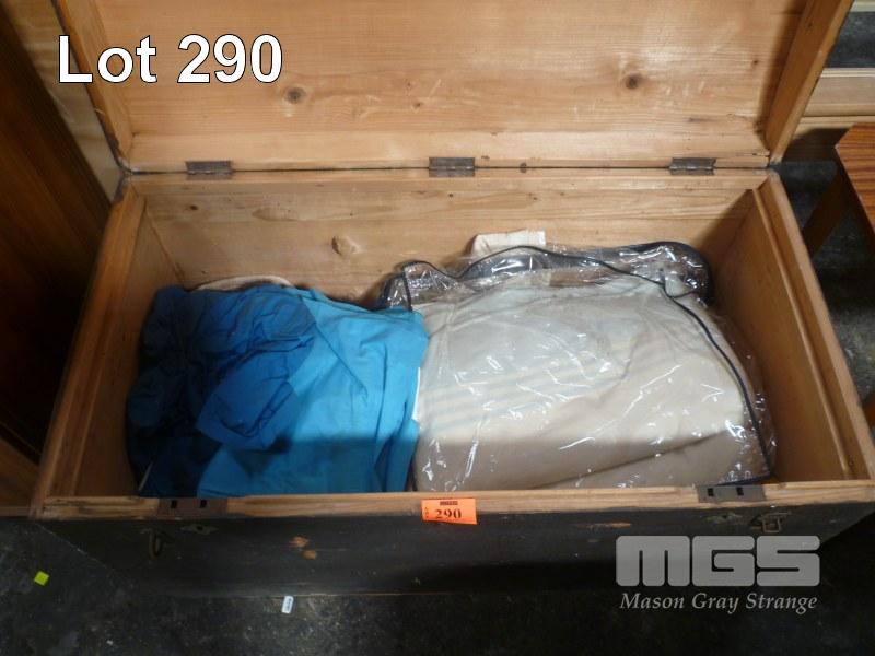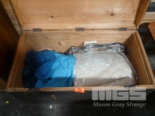 BLACK PAINTED TIMBER TRAVEL TRUNK WITH ASSORTED BEDDING