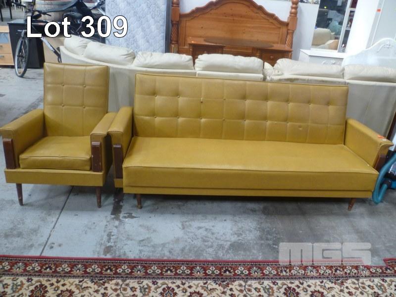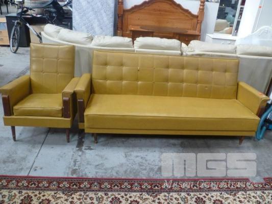 YELLOW VINYL MID CENTURY 2 PIECE LOUNGE SUITE INC 3 SEATER CLICK CLACK LOUNGE (ARM TORN) & ARM CHAIR