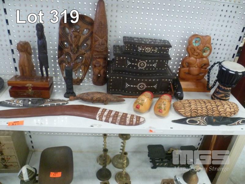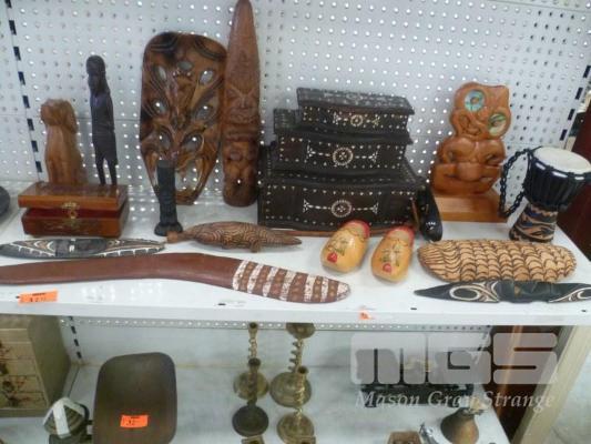 ASSORTED TREEN INC GRADUATING JEWELLERY CASES, TRIBAL STYLE STATUES, BOOMERANG, DRUM, ETC
