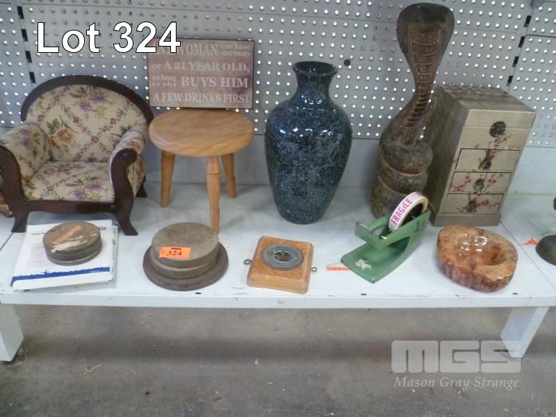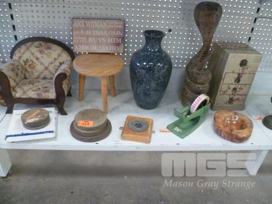 DOLLS CHAIR, GLAZED VASE, COBRA ORNAMENT, JEWELLERY BOX, VINTAGE FILM REELS, ETC