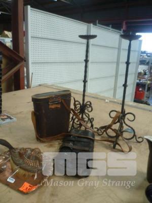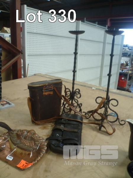 PAIR WROUGHT IRON CANDLE HOLDERS, SEIS 16 x 50 BINOCULARS, 1 x LENS LOOSE, VINTAGE LEATHER SATCHEL & COPPER DUST PAN WITH BRUSH