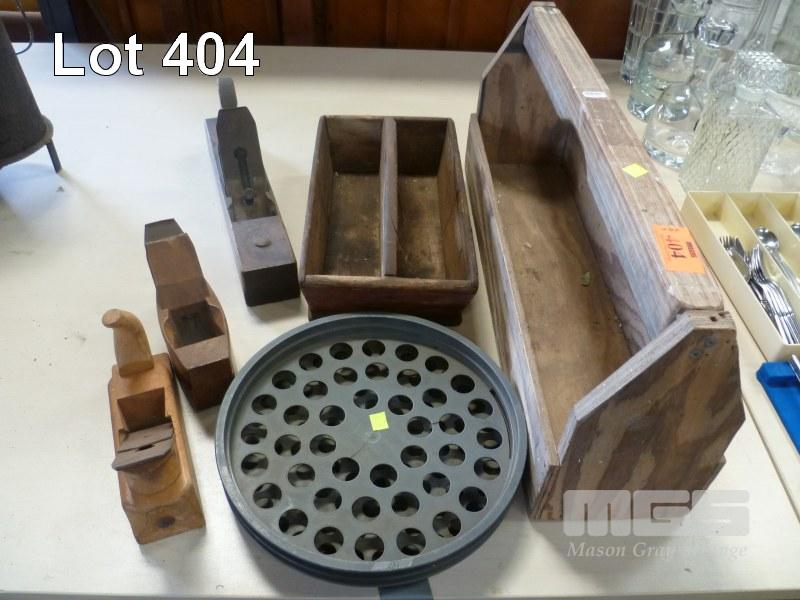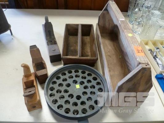 2 x VINTAGE CARPENTERS TOOL BOXES, 3 x VINTAGE WOOD PLANES & PLASTIC SIEVE